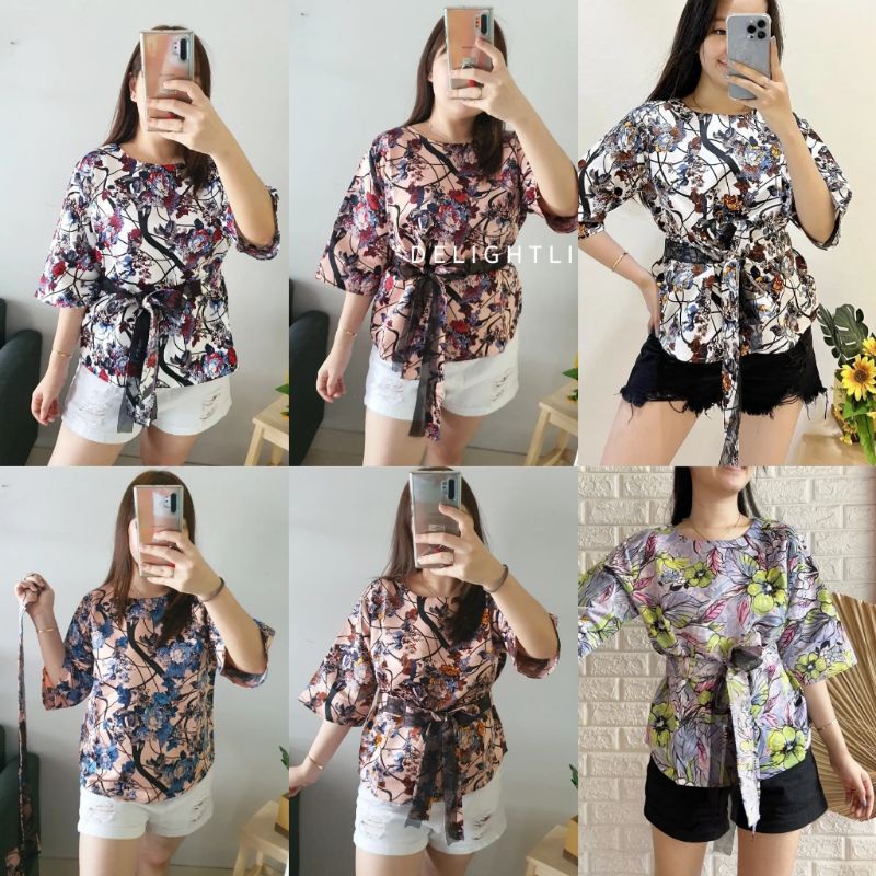RIBBON BOW TIED TOP BLOUSE WANITA BLACKOUT DELIGHTLINE - MOTIF SAKURA FLOWER - LENGAN PANJANG 7/8