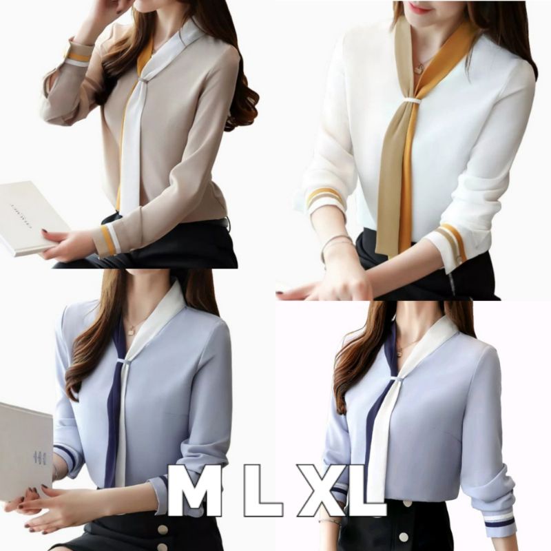 Blouse Wanita Blus Kerja Kantor Lengan Panjang Putih Polos Variasi Syal Leher Korean Style - ARRA